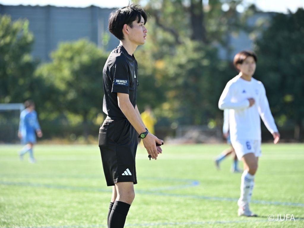 インディペンデンスリーグ全国大会の 1 回戦から準決勝まで派遣していただき、本当に大きな経験になりました。この大会で大学サッカー生活を終える選手もいる中、その試合に審判として関われたことをとても誇らしく感じました。また、地域を代表するチーム同士の試合は強度も高く、その中で審判として学ぶことがたくさんありました。 研修会の中で特に印象に残ったのは、「審判は試合を進行させる役割を持っている」 という言葉です。笛ひとつで試合を止めたり、続けさせたりできる立場だからこそ、 試合をスムーズに進めるためにも“ショート・シンプル・クリア”を意識して伝えるこ との大切さを深く実感しました。 この経験を地域に戻って還元し、自分のレベルアップに繋げていきたいです。